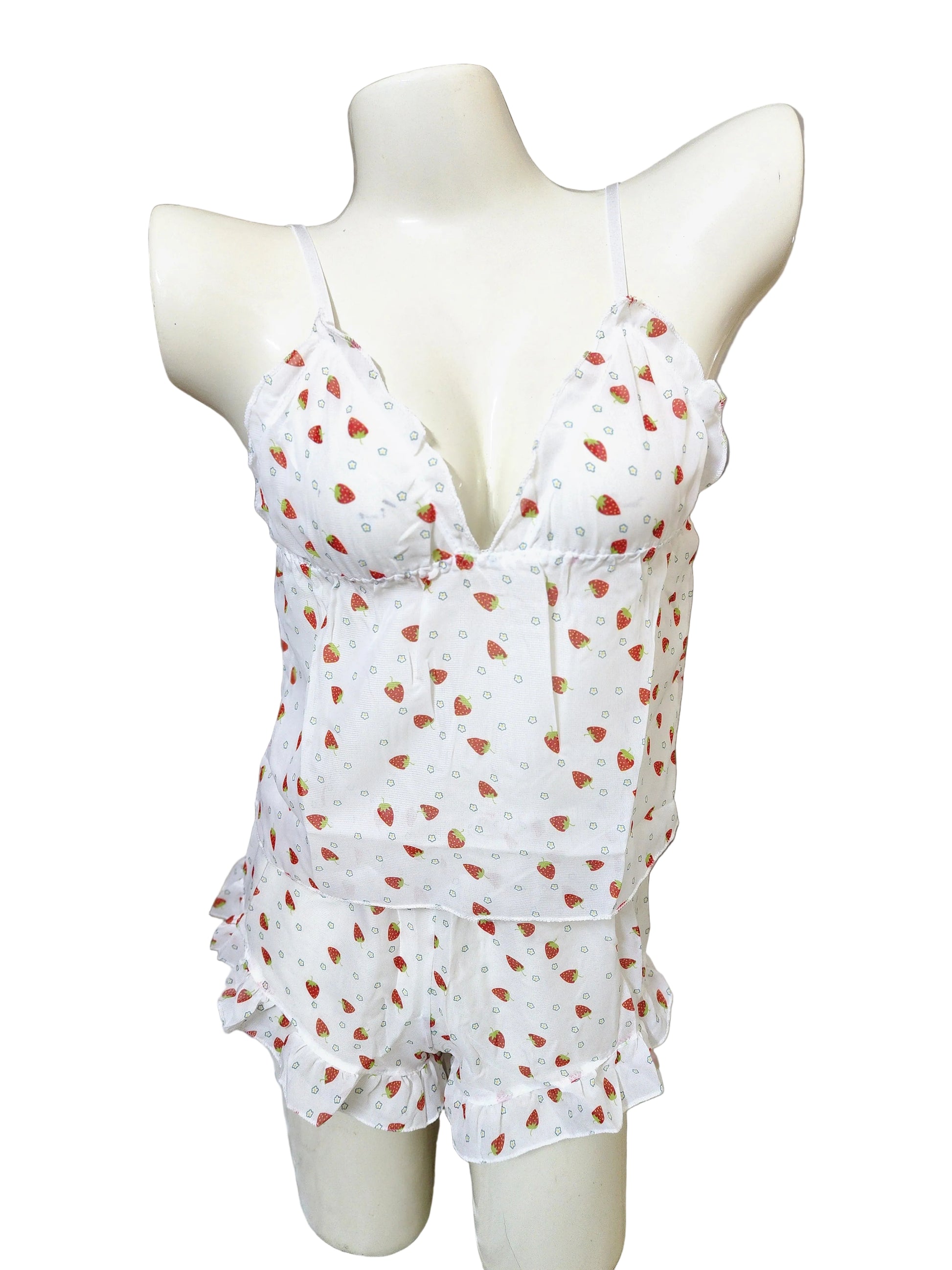 Turn up the charm with our Strawberry Printed See-Through Mesh Cami Set — a flirty fusion of sweetness and seduction. Crafted from soft sheer mesh, this playful set features a delicate strawberry print that gives a cute yet daring look, perfect for those who love a mix of innocence and allure.