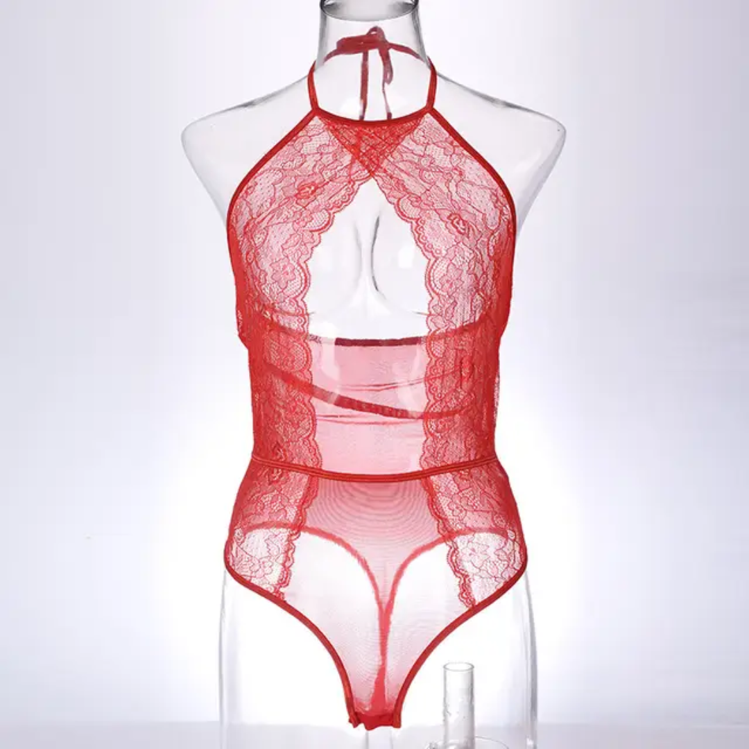 Dare to stand out in this alluring lace bodysuit that perfectly blends elegance and seduction. Designed with a halter neckline and sheer floral lace panels, it creates a sensual silhouette while offering just the right amount of coverage. The scalloped lace detailing and figure-hugging fit make it a statement piece for any intimate occasion.