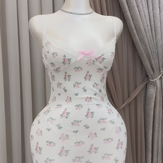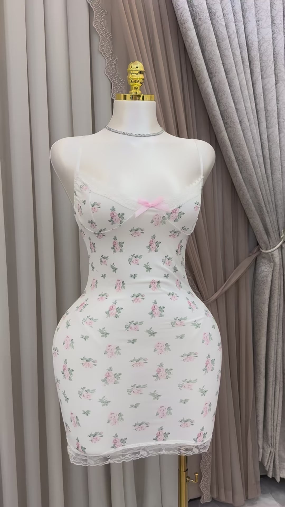 Bring effortless charm to your nights with this delicate floral slip dress. Designed with a soft cream base and dainty pink rose prints, it offers a romantic and feminine look. The deep V-neckline is accented with lace detailing, while the adjustable spaghetti straps ensure a comfortable fit. Finished with a lace-trim hem, this piece is perfect for lounging in style or adding a touch of elegance to your nightwear collection.
