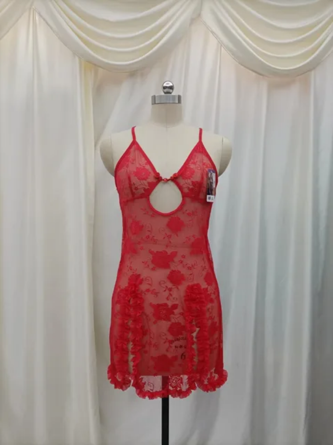What truly sets this nightdress apart are the alluring high-leg slits on both sides of the short skirt, which are softly trimmed with delicate ruffles. This detail ensures dramatic movement and a touch of flirtatious charm.