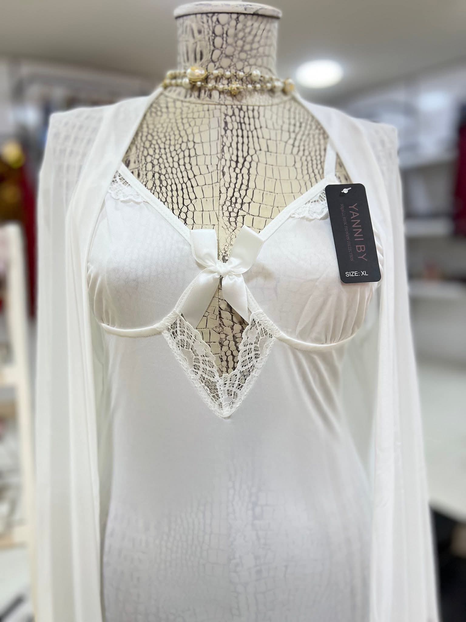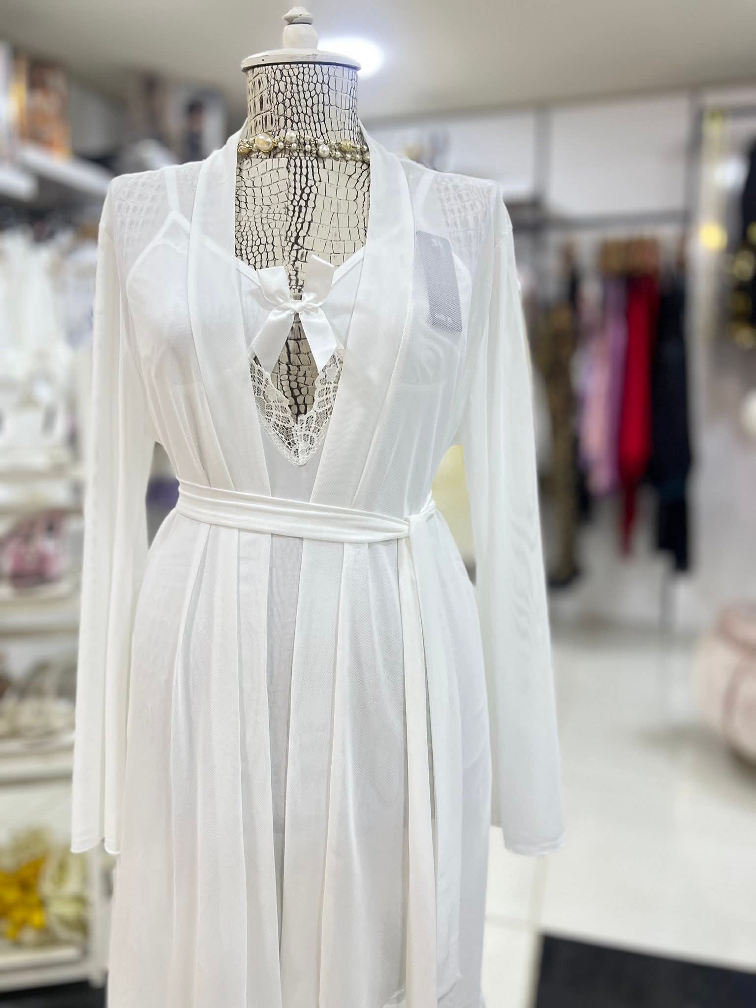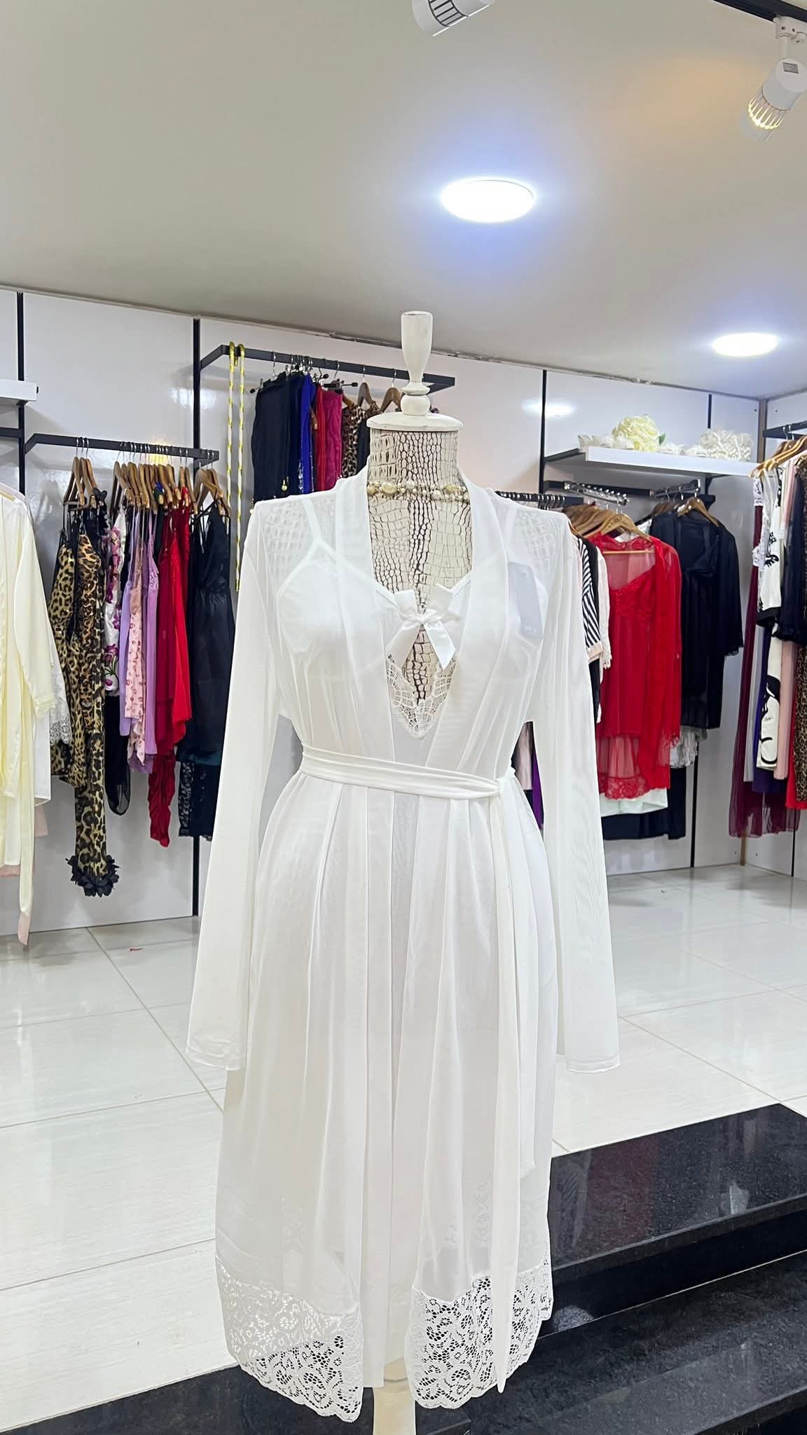 The Robe (Dressing Gown): A soft, sheer mesh kimono-style robe with wide sleeves and a long, flowing silhouette. The edges of the robe are beautifully finished with a wide, intricate lace border, offering an element of elegant coverage and drama.