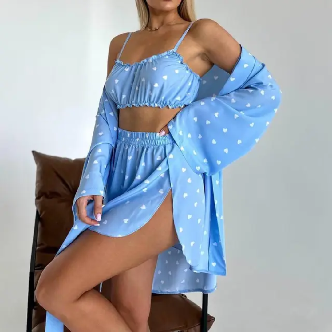 Wrap yourself in elegance and comfort with the Sweetheart Satin Nightwear Set. This 3-piece set includes a soft cotton bralette, matching shorts, and a flowy robe with a tie waist. Designed with delicate heart patterns, it’s the perfect blend of cozy and chic—ideal for lounging at home or elevating your bedtime look. The lightweight satin fabric feels smooth against the skin, making every night a little more luxurious.